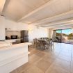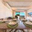 Dal soggiorno si accede al grande terrazzo fronte mare, arredato con lettini, tavolo da pranzo e zona relax.